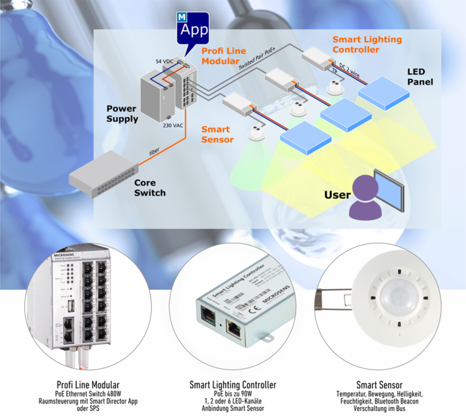 LED-Leuchten werden über das Datennetz gesteuert und über die Datenleitung durch Power-over-Ethernet (PoE) auch gleich mit Strom versorgt. Das Zusammenspiel von Sensoren, LED-Leuchten und intelligenter Steuerung bietet Anwendern ein Höchstmaß an Komfort und Effizinez, das mit herkömmlichen Beleuchtungslösungen nicht erreicht werden kann. Investoren und Gebäudebetreiber profitieren dabei von wesentlich geringeren Kosten, sowohl bei der Errichtung als auch im Betrieb.
