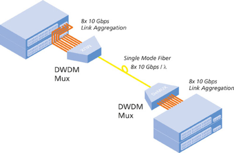 Anders als beim CWDM bewegt sich die Übertragungsfrequenz im DWDM stets im optimalen C-Band, die Kanalabstände sind mit 0,8nm deutlich enger ausgerichtet.