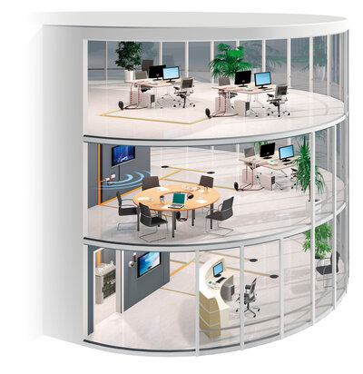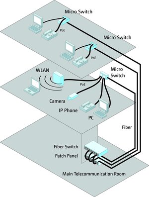MICROSENS FTTO utiliza una arquitectura de red troncal colapsada altamente eficiente, las conexiones de fibra óptica de alto rendimiento se encaminan en una configuración en estrella desde el cuarto técnico central del edificio hasta el usuario, los enlaces ascendentes y el cableado horizontal en piso están completamente realizados en tecnología de fibra óptica a prueba de futuro, terminados a través de un MicroSwitche MICROSENS y utilizados como puertos de cobre flexibles para conectar estaciones de trabajo informáticas, de este modo, Fiber To The Office aprovecha las ventajas técnicas de la fibra óptica, como el mayor alcance y la resistencia a las interferencias electromagnéticas, sin limitar la flexibilidad de la tecnología de cobre en el área de usuarios.