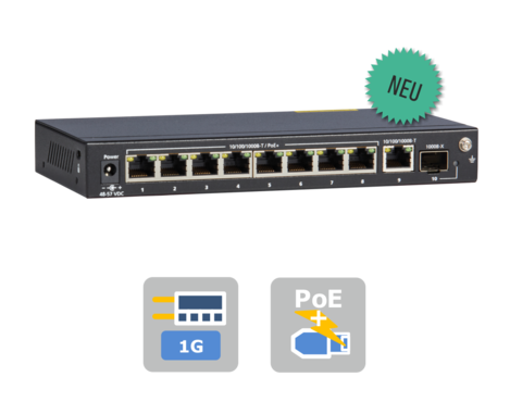 10-Port GbE Desktop Switch PoE+, 1x 1000X SFP slot, 9x 10/100/1000T, of which 8x PoE+, ext. PS (110/230VAC)