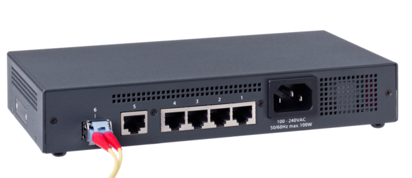 Via the modular transceiver port (SFP, 1000Base-X) a fiber optic interface can be connected. The switch has a total of 9 copper ports in 10/100/1000Base-T auto negotiation, 8 of these ports with PoE+ PSE function. The total PoE budget is 120W to supply multiple ports in parallel with full PoE+ power according to IEEE802.3at.