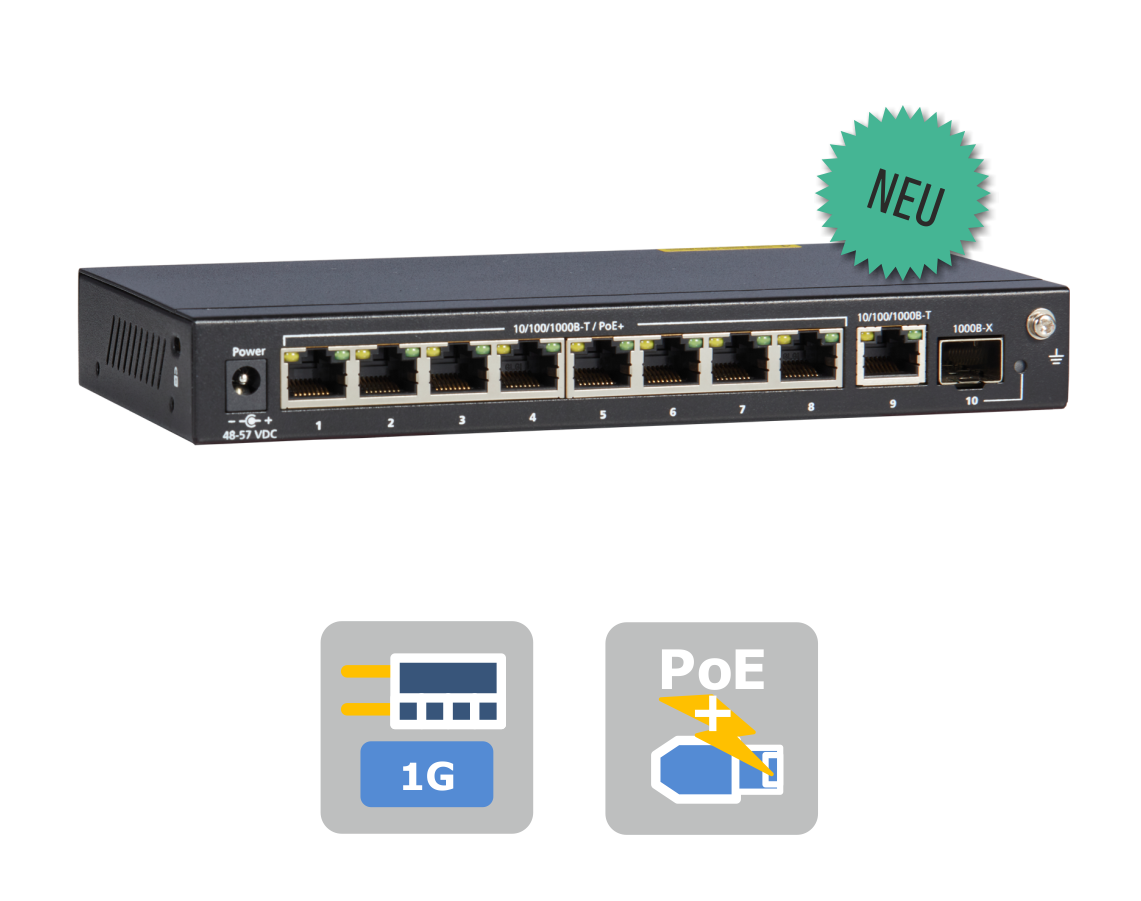 • Gigabit Ethernet 10-Port Desktop Switch with 8x PoE+ according to IEEE802.3at