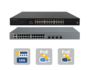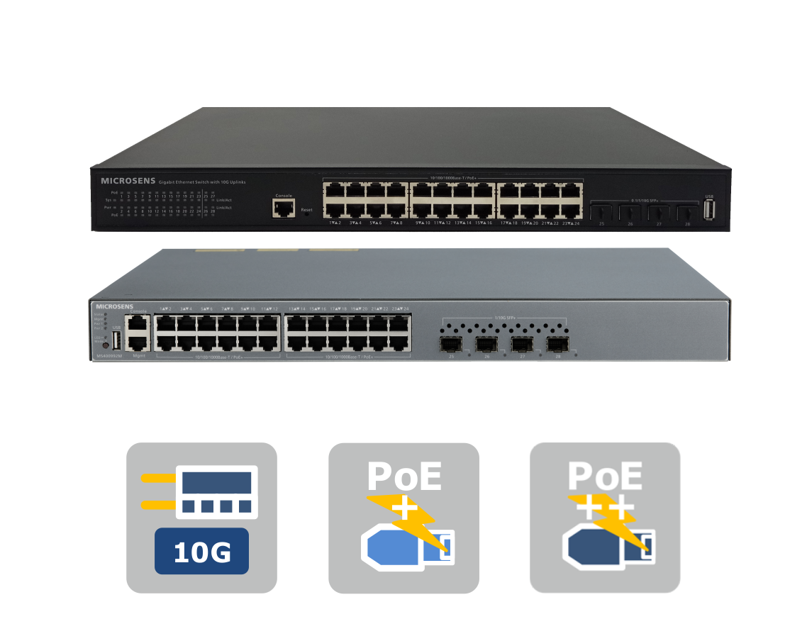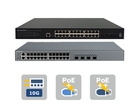 The 28 port switch has 4x 100/1000X ports. This enables a direct connection to a GBE fiber optic backbone via standard SFP transceivers. Switches located further away can be cascaded via fiber optic cables.