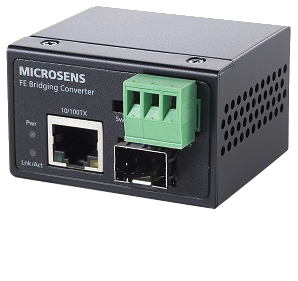 - Fast Ethernet Industrial Micro Bridge (1x 10/100Base-TX, 1x 100Base-FX SFP slot)