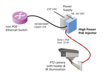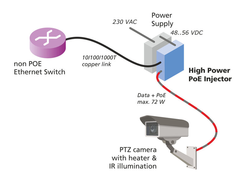GbE Industrial Entry Line PoE-Injektor HI-PoE 1x 10/100/1000T, 1x 10/100/1000T PoE 72W, DIN-Rail, -40..+75°C, 48..56VDC