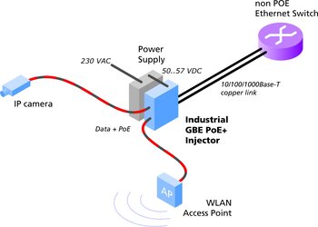 GbE Industrial Entry Line PoE-Injektor PoE+ 1x 10/100/1000T, 1x 10/100/1000T PoE+, DIN-Rail, -40..+75°C, 48..56VDC
