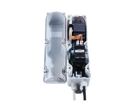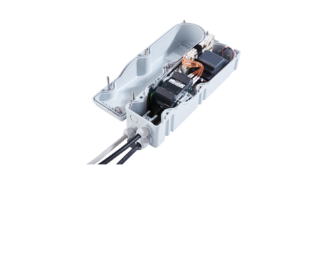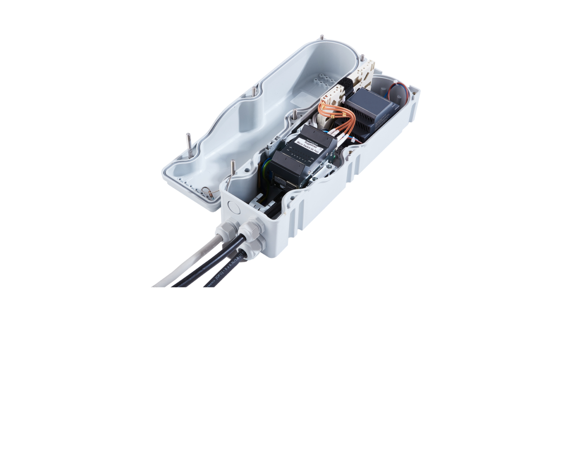 The pre-assembled IP67 housing has a fiber tray (splice cassette) and thus supports the accommodation of fiber optic connections. Furthermore, it optionally includes a 24 VDC or 48 VDC power supply, whereby the 230 VAC supply line is intercepted via an existing terminal block.