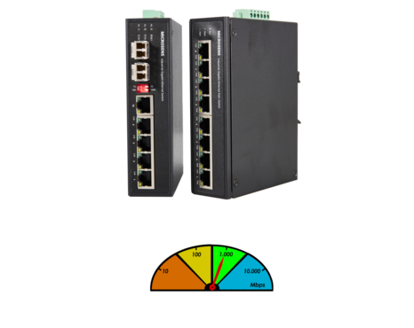 - Cost-effective plug and play Gigabit performance for industrial environments with DIN rail adaptation and extended operating temperature range -40°..+75°C