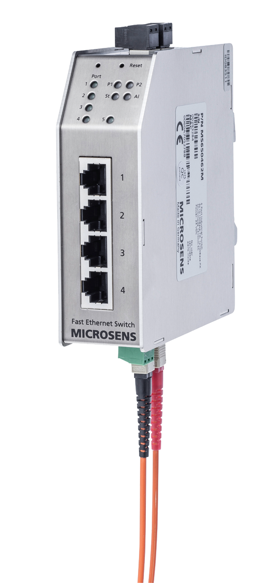 - Compact Fast Ethernet 5 port industrial switch, of which 1x FO 100FX with integrated SC / ST optics in multimode and single mode available