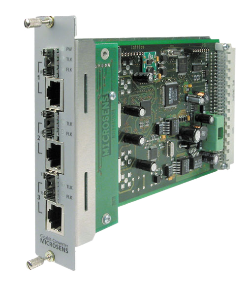 The modular design with pluggable transceivers (SFPs) gives the triple converter module a lot of flexibility. MICROSENS offers a wide range of pluggable optical transceiver modules for multimode, singleomode and single mode simplex applications. The Converter is suited for use as an active transponder card in xWDM systems if local copper ports are to be directly converted to WDM channels. In this case, three Gigabit Services can be implemented on just one card. This is an extremely compact and cost-efficient solution for WDM applications.