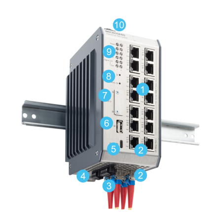 - 2 combo ports with 1/2.5/5/10 Gigabit per second and PoE++ with 90 watts of power for the integration of demanding end devices.