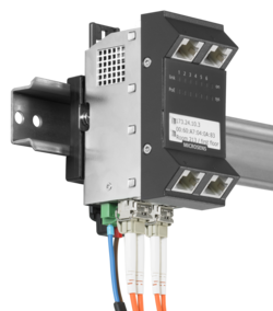 Due to its wide range of versions, it can be equipped with the required power supply (48VDC / 24VDC / 230VAC), the connection to the respective fiber optic network is made via flexible SFP transceivers. Due to its extremely compact design and the DIN rail adapter, its location can be flexibly selected from small distribution boxes up to control cabinets.